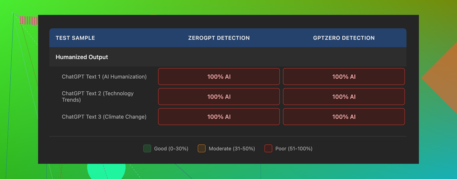 I tested it with multiple samples, then ran every output through GPTZero and ZeroGPT. Every single one came back as 100% AI. Not 60, not 80. Straight 100 on both tools.