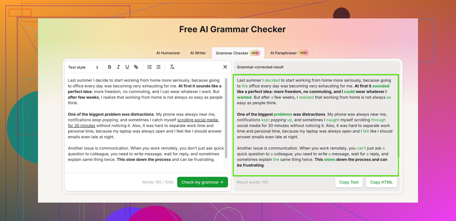 “Use a powerful online grammar and style checker that cleans up spelling, punctuation, and sentence flow while keeping your writing natural. Perfect for blog posts, emails, and social media captions, it helps you publish polished, human-sounding content in just a few clicks.”