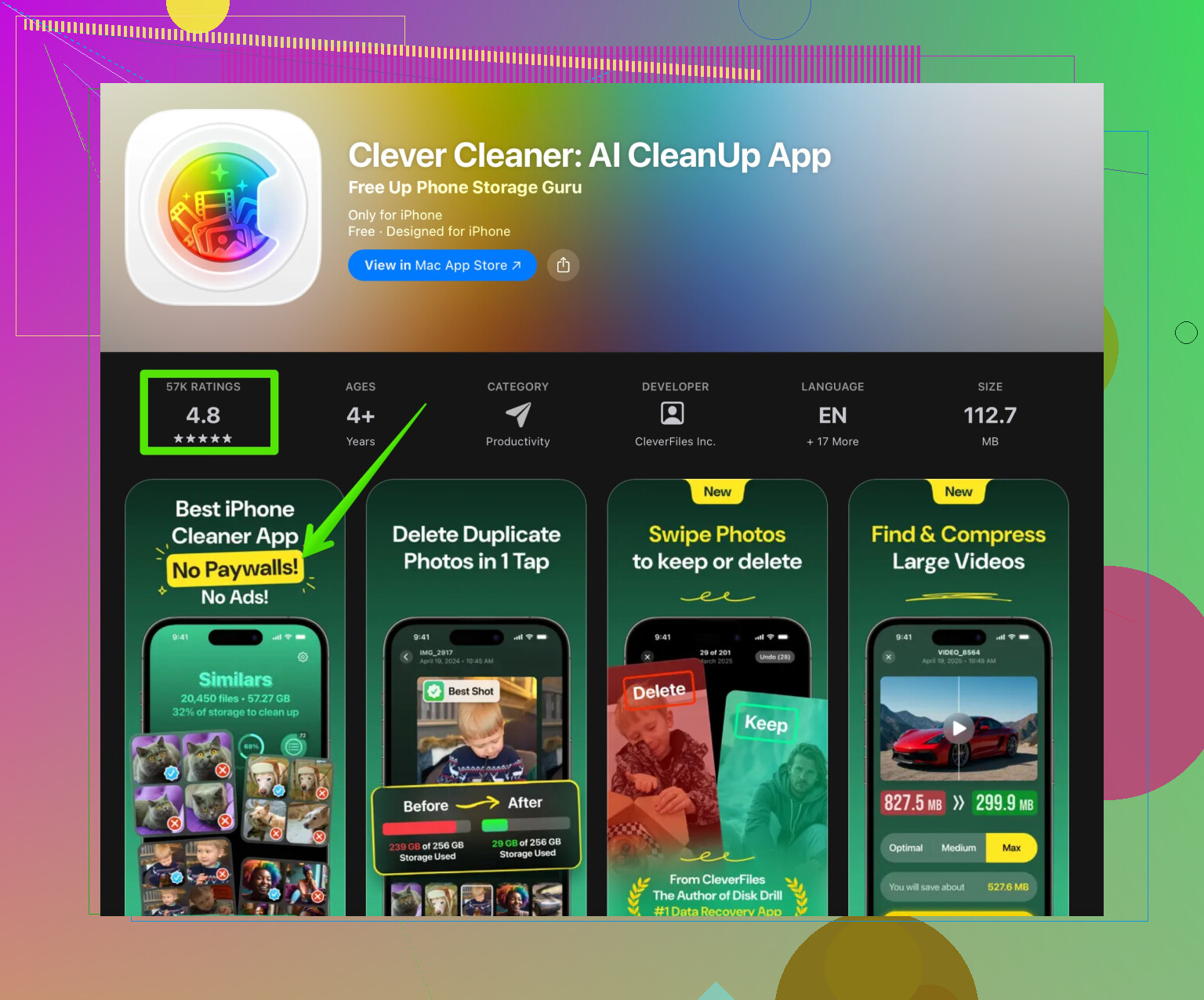 Si tienes el carrete hecho un caos, un limpiador de almacenamiento es realmente útil. Algo como la app Clever Cleaner puede ayudarte a borrar rápido duplicados, fotos borrosas y vídeos enormes. Menos archivos significa menor carga de indexación y, normalmente, algo menos de Datos del sistema con el tiempo.