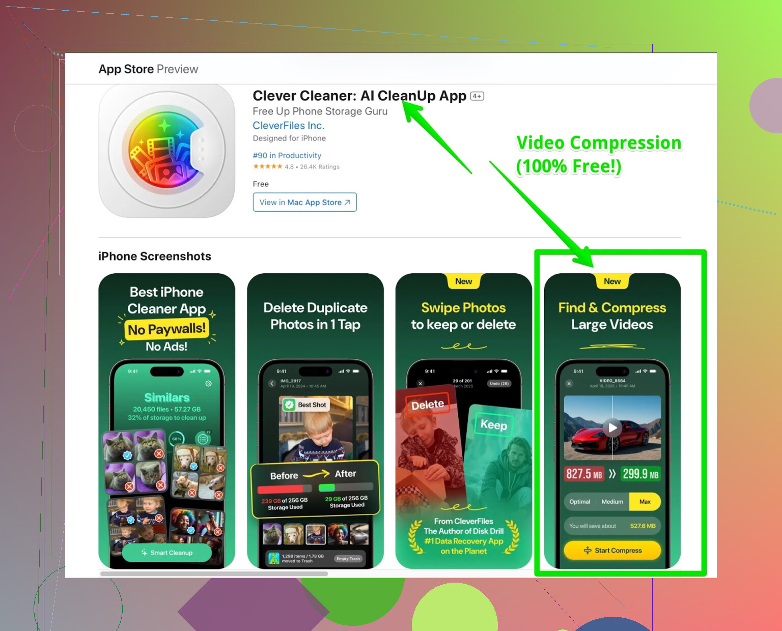 - Video Compression: Goodbye “storage almost full” notification; hello, freed-up space for cat videos and memes.