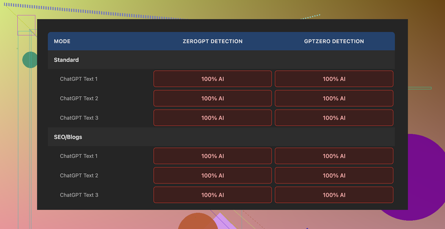 Every single output came back as 100 percent AI on both detectors. No edge cases, no borderline scores, nothing that looked remotely human to these tools.
