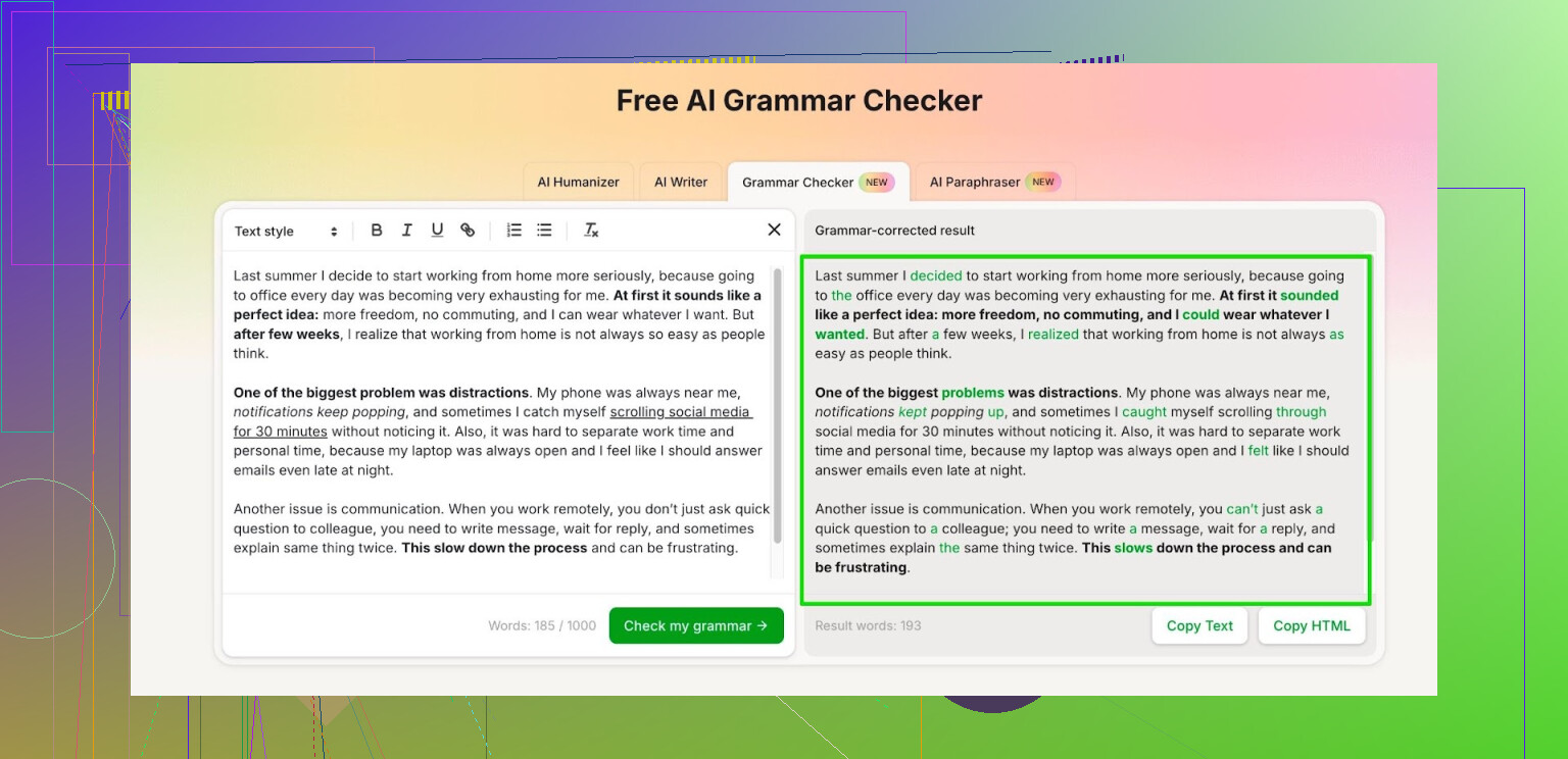 Si quieres una opción más o menos gratuita para textos largos, un corrector basado en IA como Clever AI Humanizer está más cerca de la investigación moderna. Se apoya en modelos de ML en lugar de lógica estricta de CFG, así que maneja mejor el contexto, el tono y las formulaciones torpes que los correctores puramente basados en reglas. Es bueno para ensayos, informes y borradores largos cuando quieres algo más que corregir ortografía y comas.