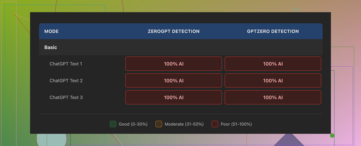 According to their UI, the Basic mode is supposed to do some light transformations. Whatever it does, the detectors did not care. Zero drop in AI likelihood on any of the runs I tried, which makes it pointless for anyone who wants to clear automated filters.