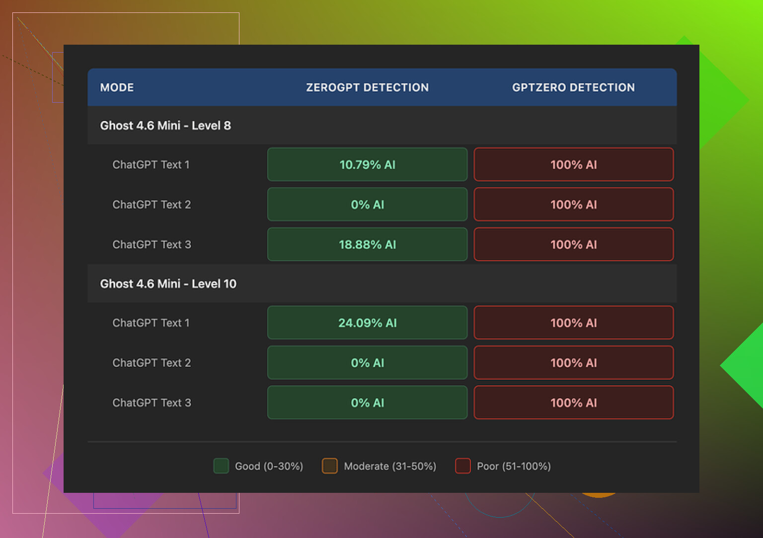 - If you feed it human text and try to “stealthify” it, it sometimes worsens readability, especially Ghost Pro at high intensity.