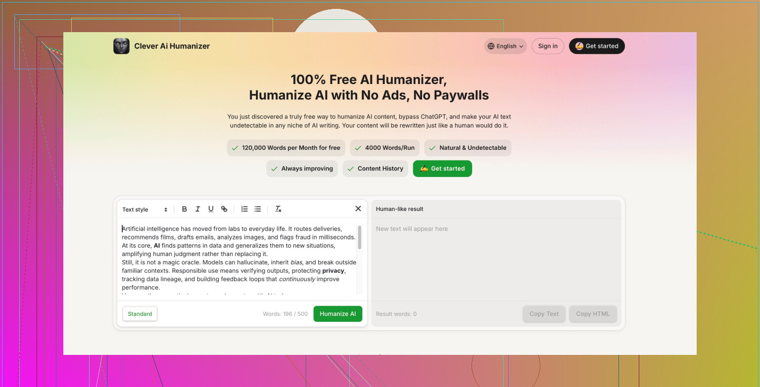 Let’s be real. Half these so-called “humanizer” sites tease you with a slick homepage, then slam you with a prompt to sign up, swipe your card, or cryptically limit you to 50 words—before hiding the rest behind a paywall. Total pain. That’s why I got hooked on Clever AI Humanizer. Honestly, it’s rare to find one that just lets you paste your text, hit convert, and walk away with something clean—no hoops, no credit cards.